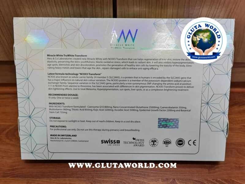 Origin Country: Miracle White Green Tru White Transform Glutathione 25000Mg is made in Switzerland.